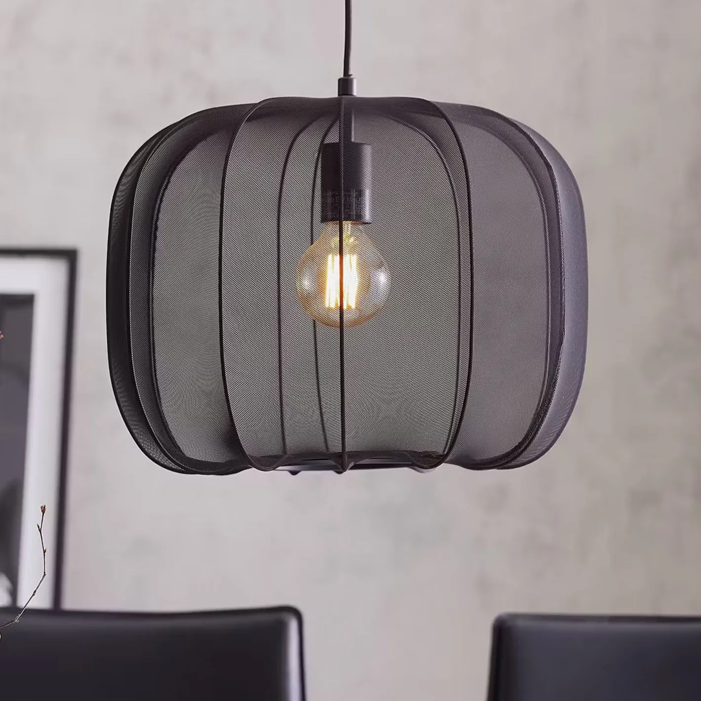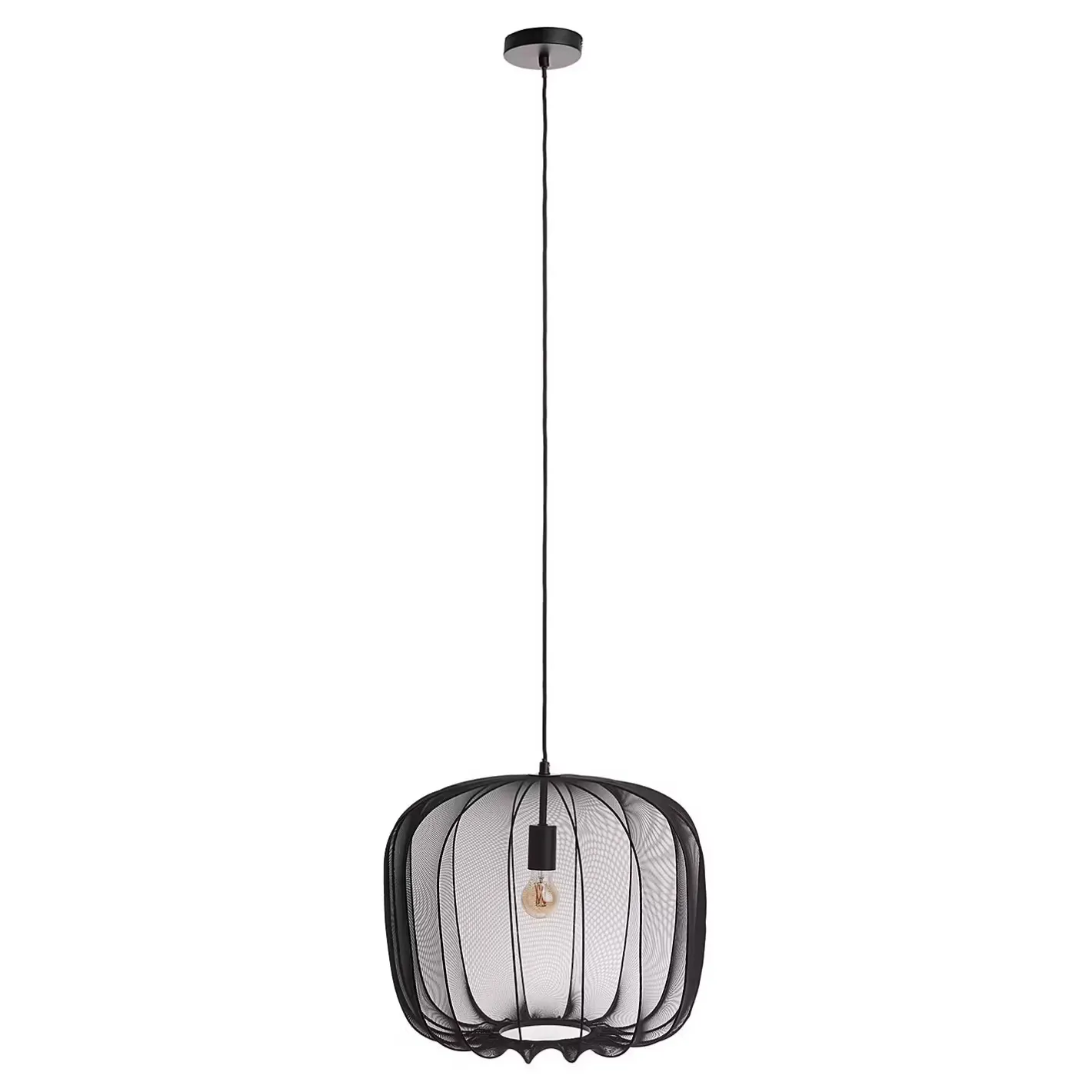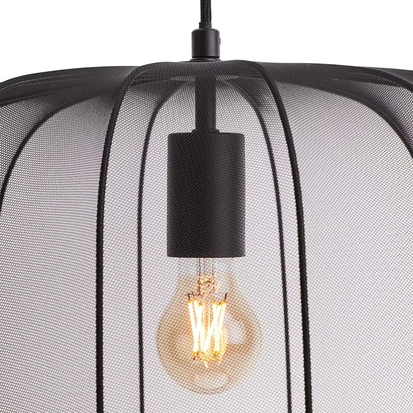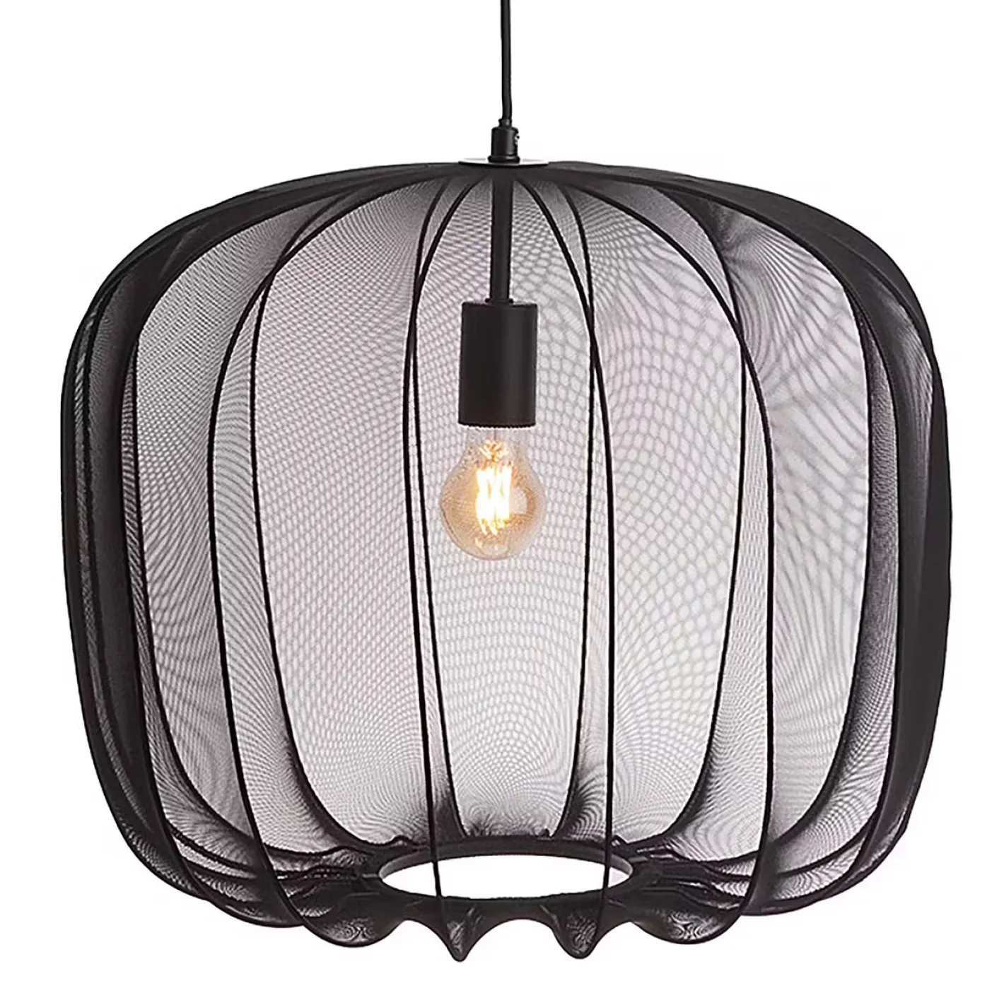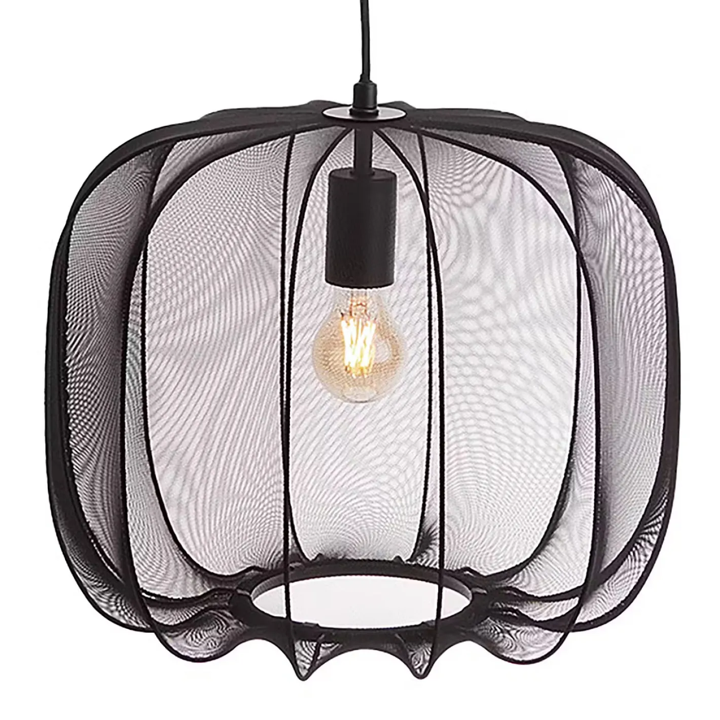 Ein Hauch von Extravaganz umgibt die moderne Amal Hängeleuchte. Ihr schlanker Schirm ist mit einem transparentem Netzgewebe überzogen, der den Blick auf geschwungene Gestell aus Eisen freigibt. Gerade diese Verbindung von exklusivem Design und hochwertiger Materialauswahl verleiht der Tischleuchte eine fast geheimnisvolle Ausstrahlung. Als Hängeleuchte in zwei Größen in den Farben Creme und Schwarz erhältlich, auch als passende Stehleuchte und Tischleuchte.