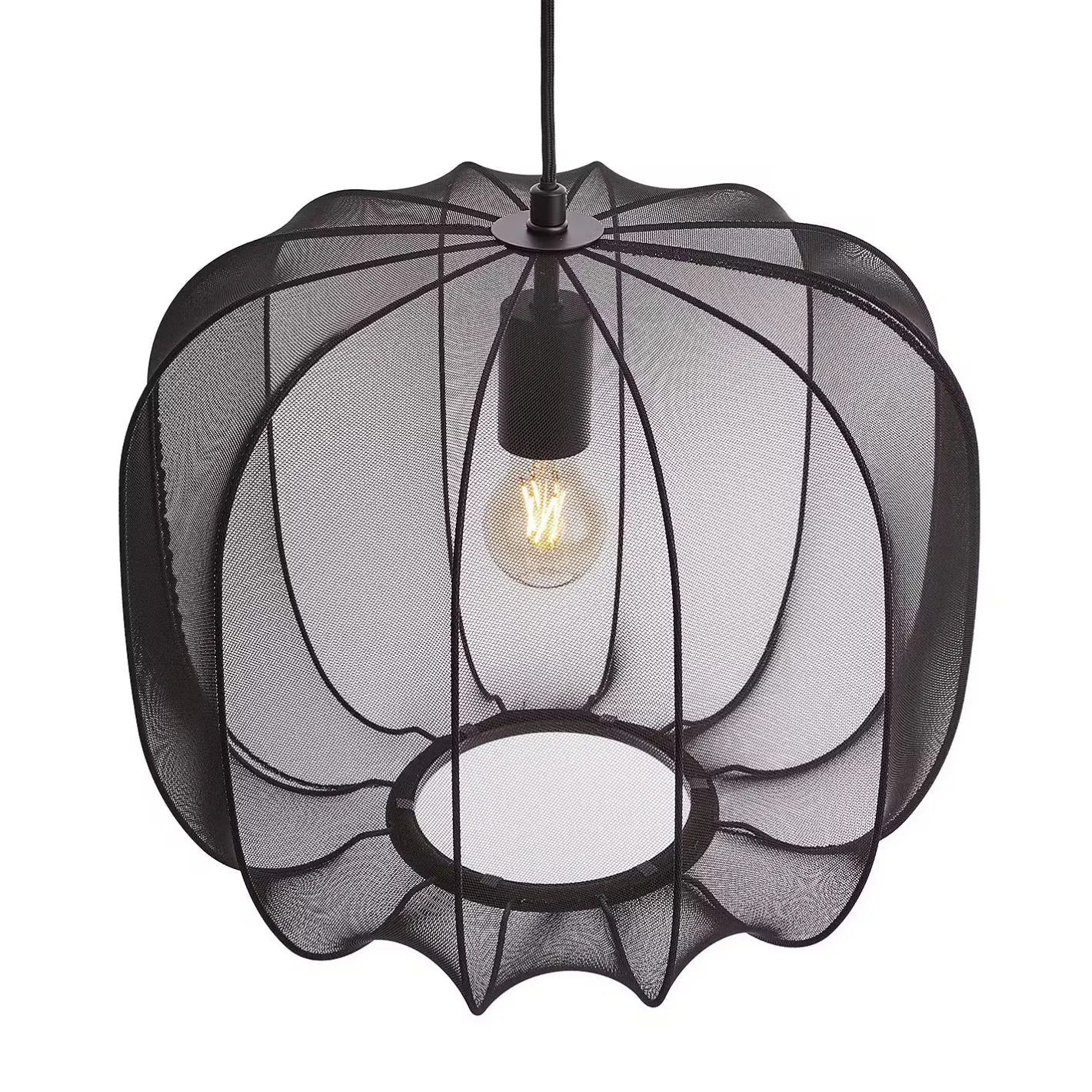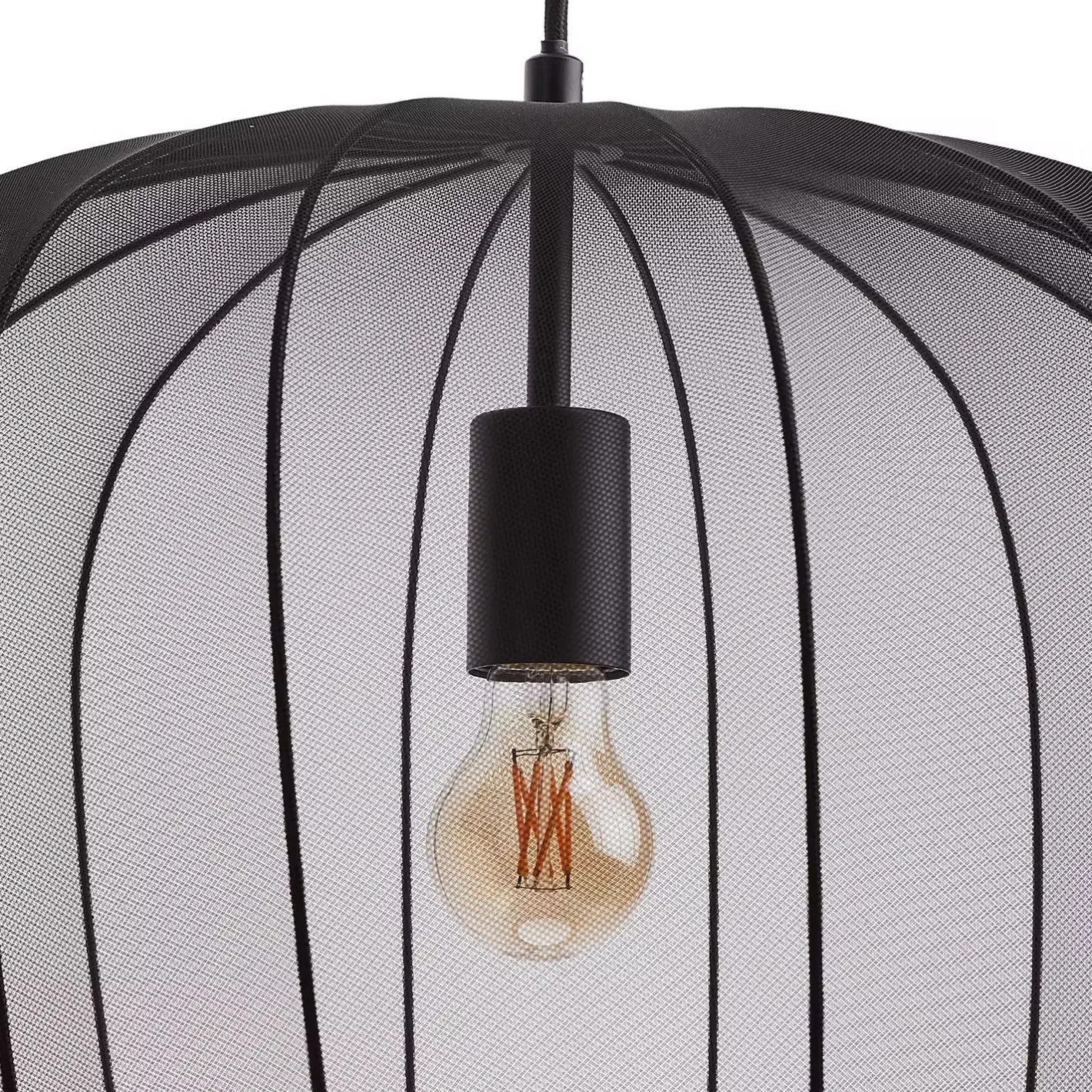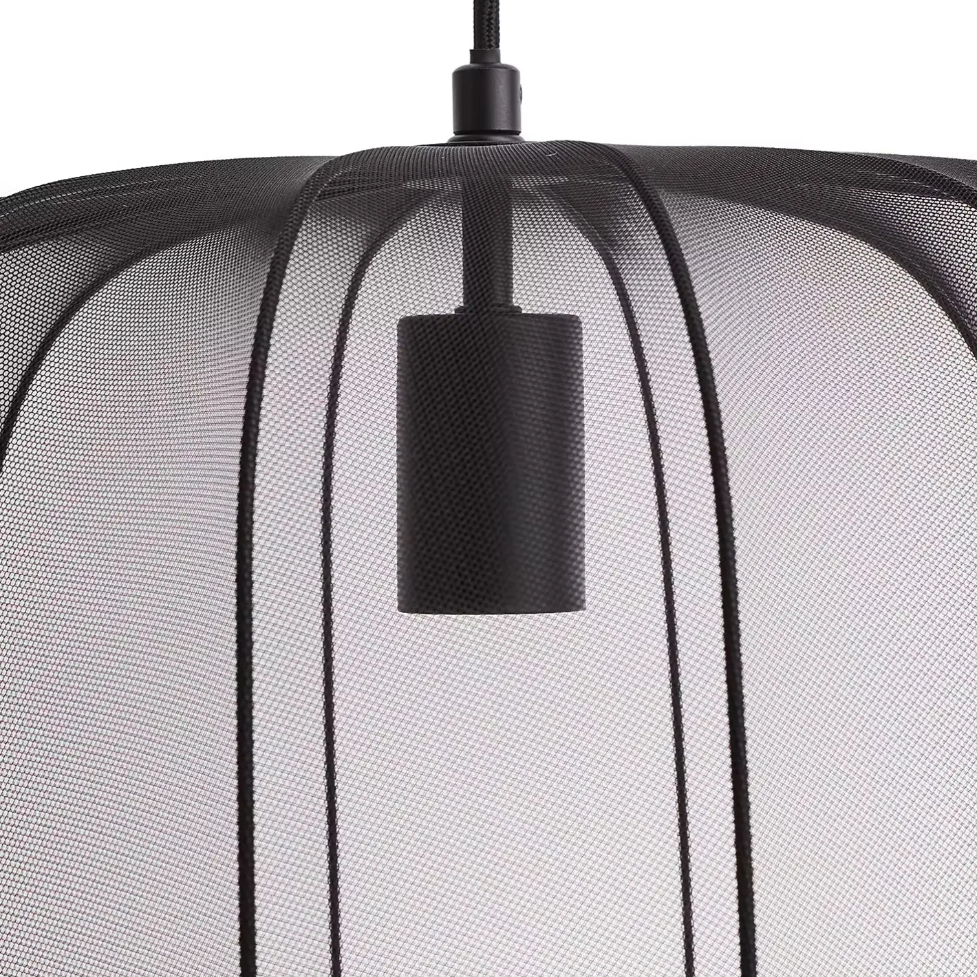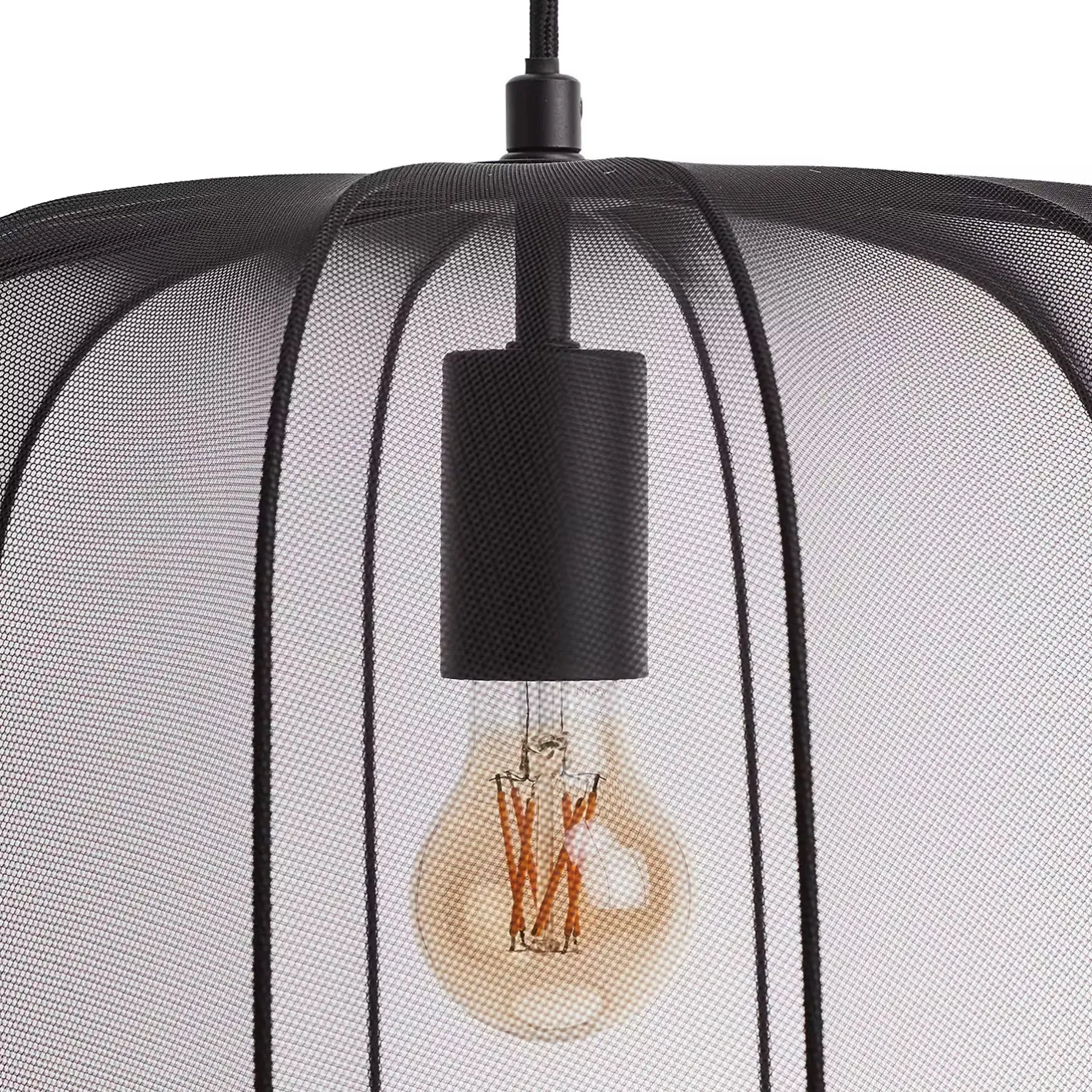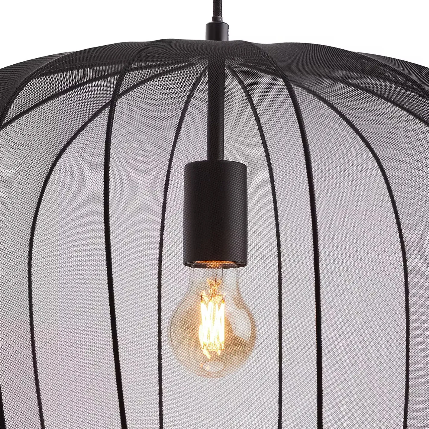 Ein Hauch von Extravaganz umgibt die moderne Amal Hängeleuchte. Ihr schlanker Schirm ist mit einem transparentem Netzgewebe überzogen, der den Blick auf geschwungene Gestell aus Eisen freigibt. Gerade diese Verbindung von exklusivem Design und hochwertiger Materialauswahl verleiht der Tischleuchte eine fast geheimnisvolle Ausstrahlung. Als Hängeleuchte in zwei Größen in den Farben Creme und Schwarz erhältlich, auch als passende Stehleuchte und Tischleuchte.