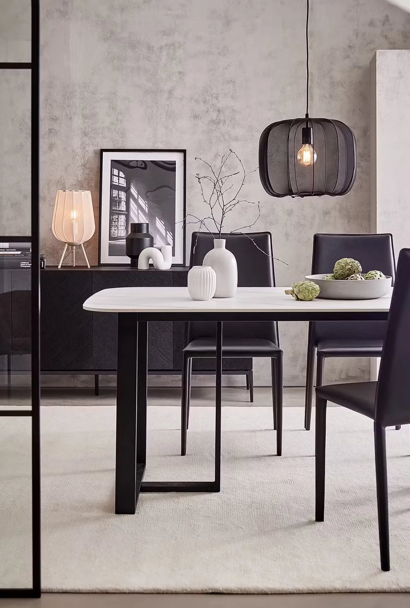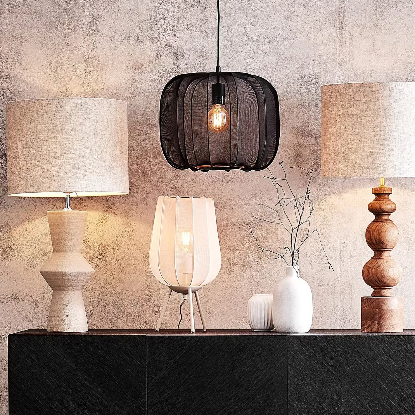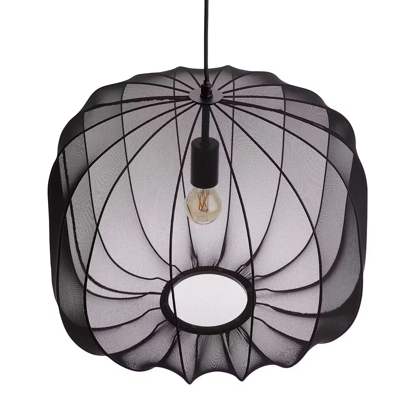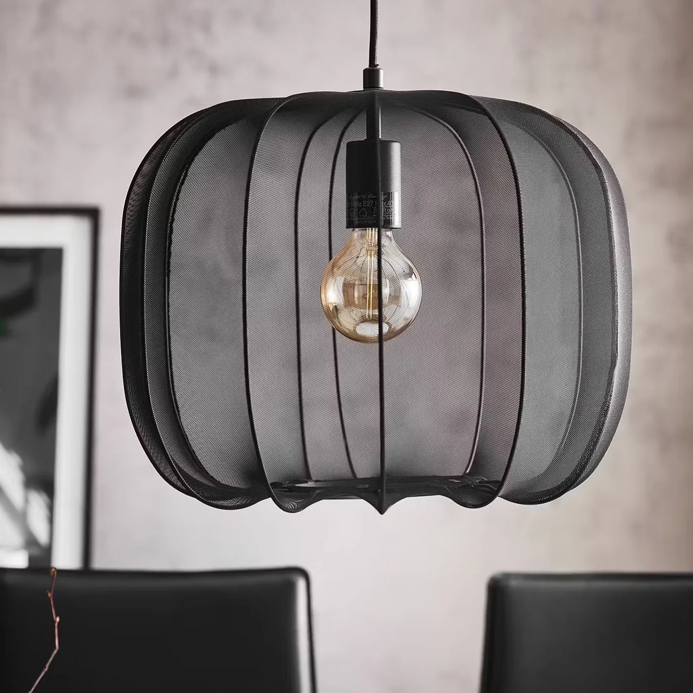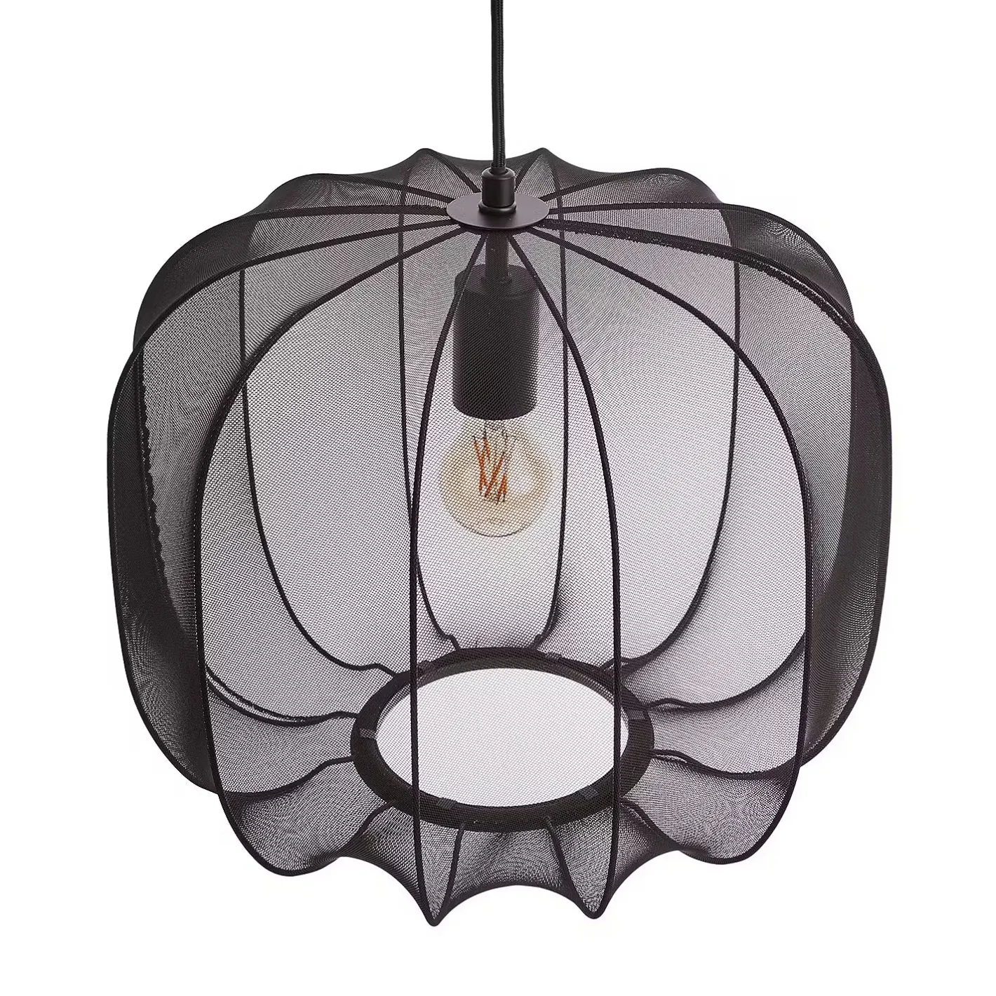 Ein Hauch von Extravaganz umgibt die moderne Amal Hängeleuchte. Ihr schlanker Schirm ist mit einem transparentem Netzgewebe überzogen, der den Blick auf geschwungene Gestell aus Eisen freigibt. Gerade diese Verbindung von exklusivem Design und hochwertiger Materialauswahl verleiht der Tischleuchte eine fast geheimnisvolle Ausstrahlung. Als Hängeleuchte in zwei Größen in den Farben Creme und Schwarz erhältlich, auch als passende Stehleuchte und Tischleuchte.