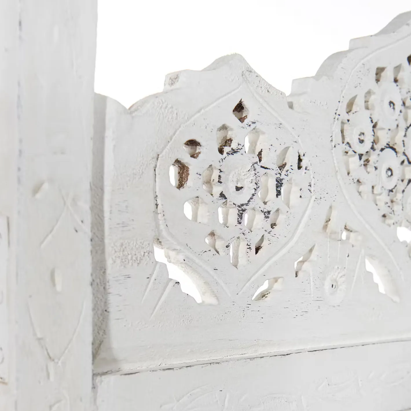 Als stamme er aus einer spanischen Finca, einer italienischen Villa oder einer portugiesischen Posada: Unser weißer Estella-Paravent mit femininen Ornamenten versehen, präsentiert sich charmant nostalgisch und aufwändig gearbeitet. Mit Liebe für das Detail. Denn er wurde von Hand gefertigt und bemalt. Ob als Raumteiler, als Sichtschutz oder Dekoelement: Der Paravent im Vintage-Look ist vielseitig nutzbar und weist zu dem einen modernen Shabby-Chic-Stil auf.