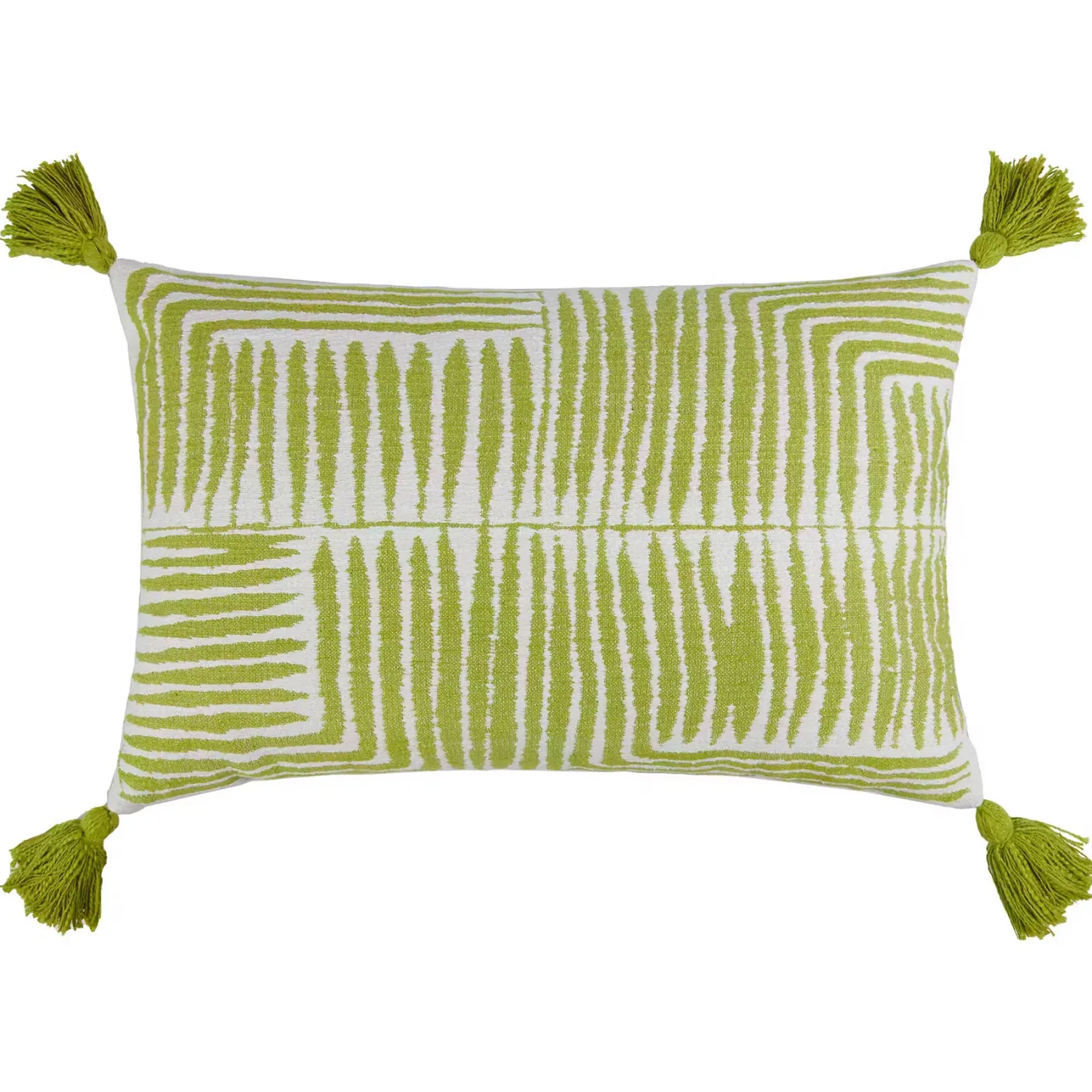 So modern und grafisch kann Ethno sein! Das Gaia Zierkissen 40 x 60 cm mit Tasseln begeistert mit zeitgemäßem Design und einem schönen Grün, das sich super kombinieren lässt. So dekorierst du das Kissen beispielsweise mit anderen Naturtönen oder sommerlichen Farben. Bezug aus 70 % Baumwolle und 30 % Polyacryl, mit Reißverschluss. Rückseite neutral. Füllung aus 100 % Polyester.