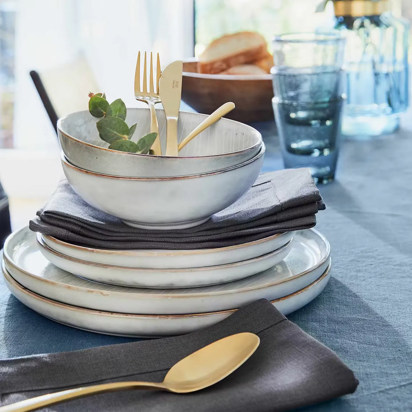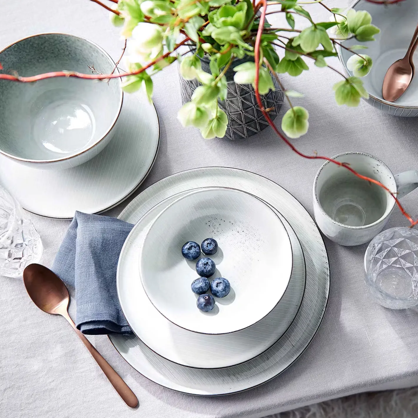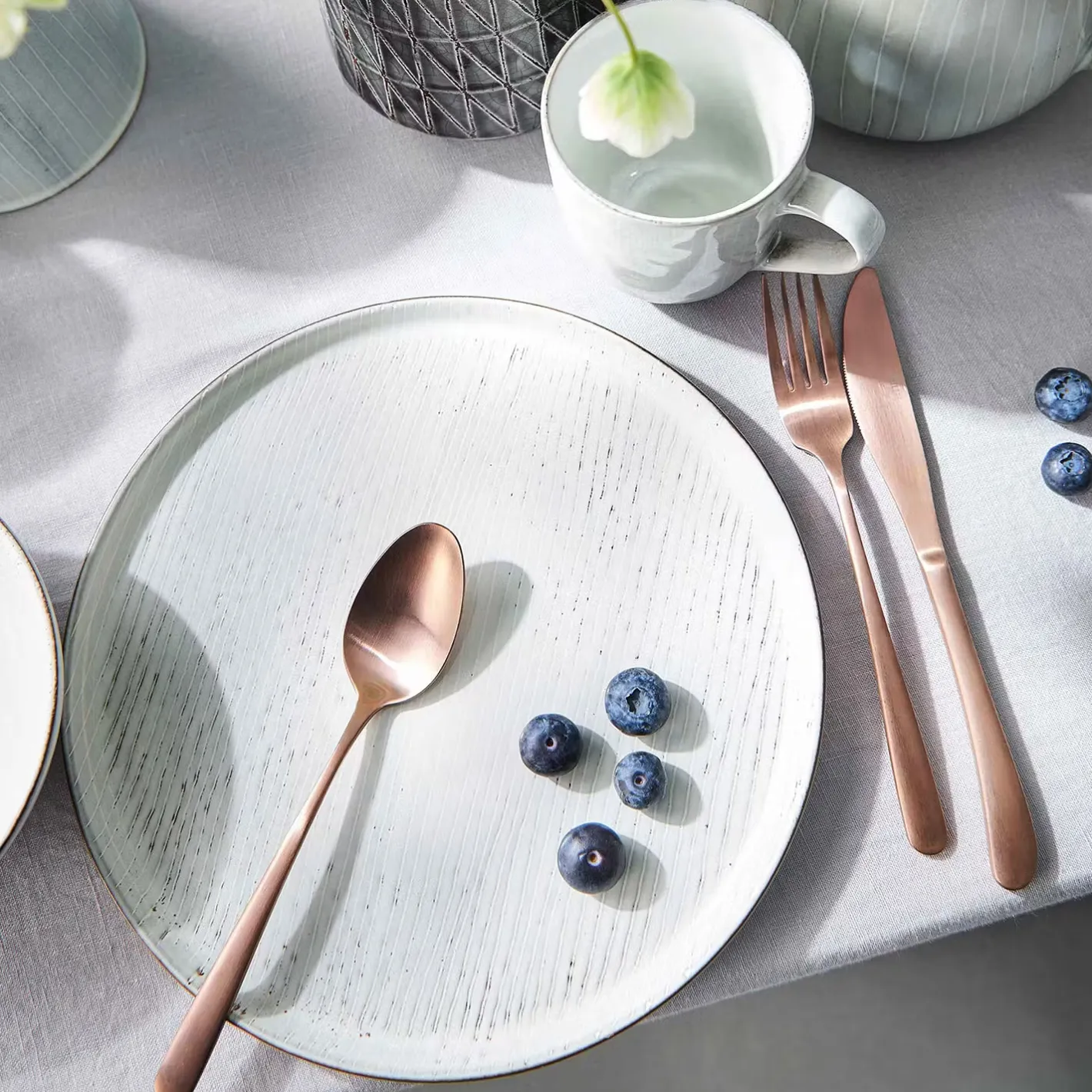 - Material: Steinzeug, reaktive Glasur
