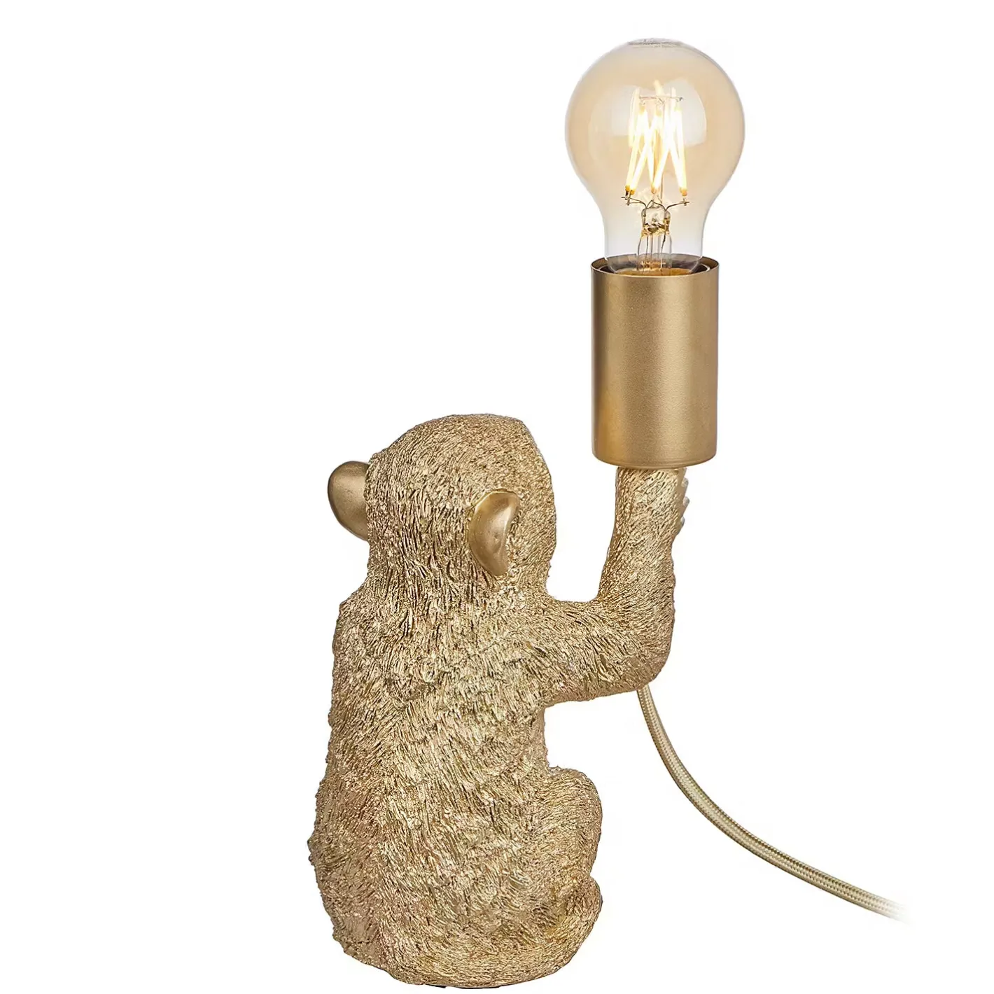 Außergewöhnliche Tierleuchten wie die Monkey Town Tierleuchte Affe sind ein raffiniertes Accessoire, das deinem Zuhause Persönlichkeit verleiht. Mit einem leicht provokanten Augenzwinkern bringt diese Tischlampe in Form eines sitzenden Affen deinen selbstbewussten Stil zum Ausdruck – z.B. als Blickfang im Wohnzimmer. Mit Textilkabel in passender Farbe und Kippschalter. Erhältlich in Gold und in Schwarz.