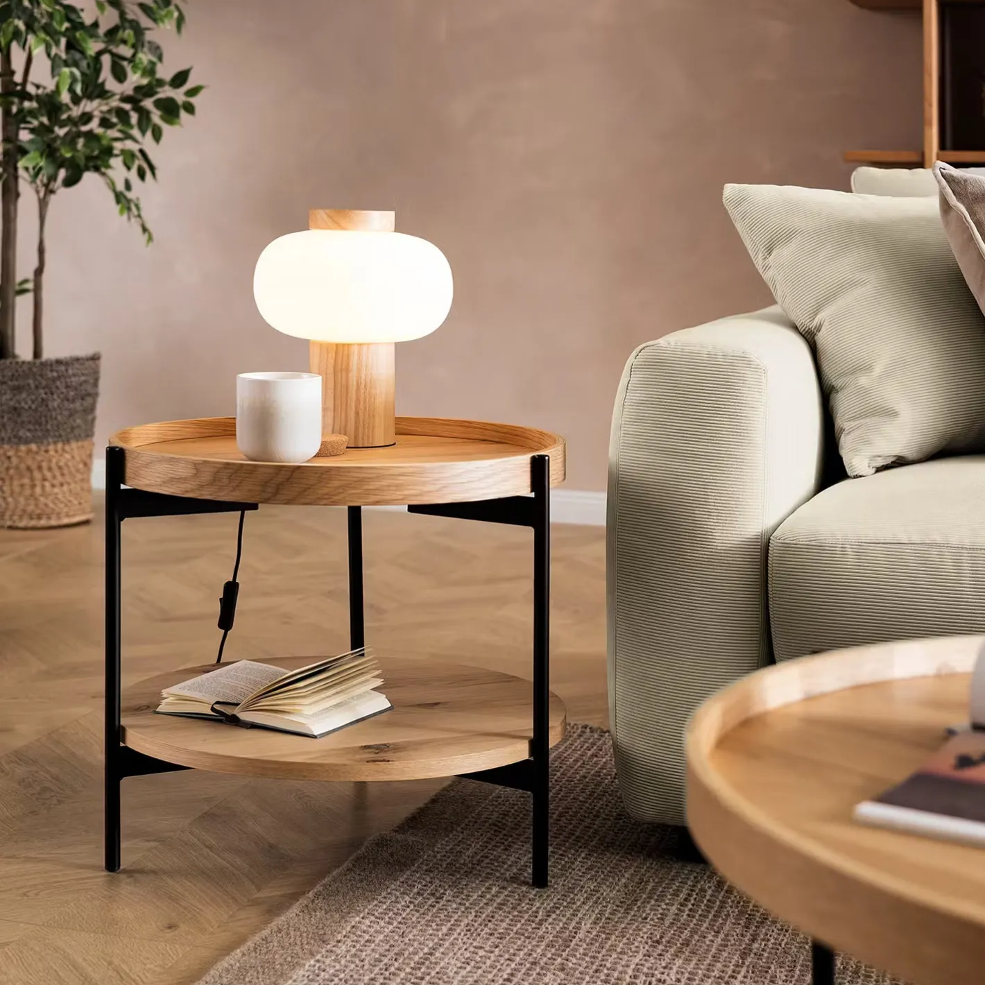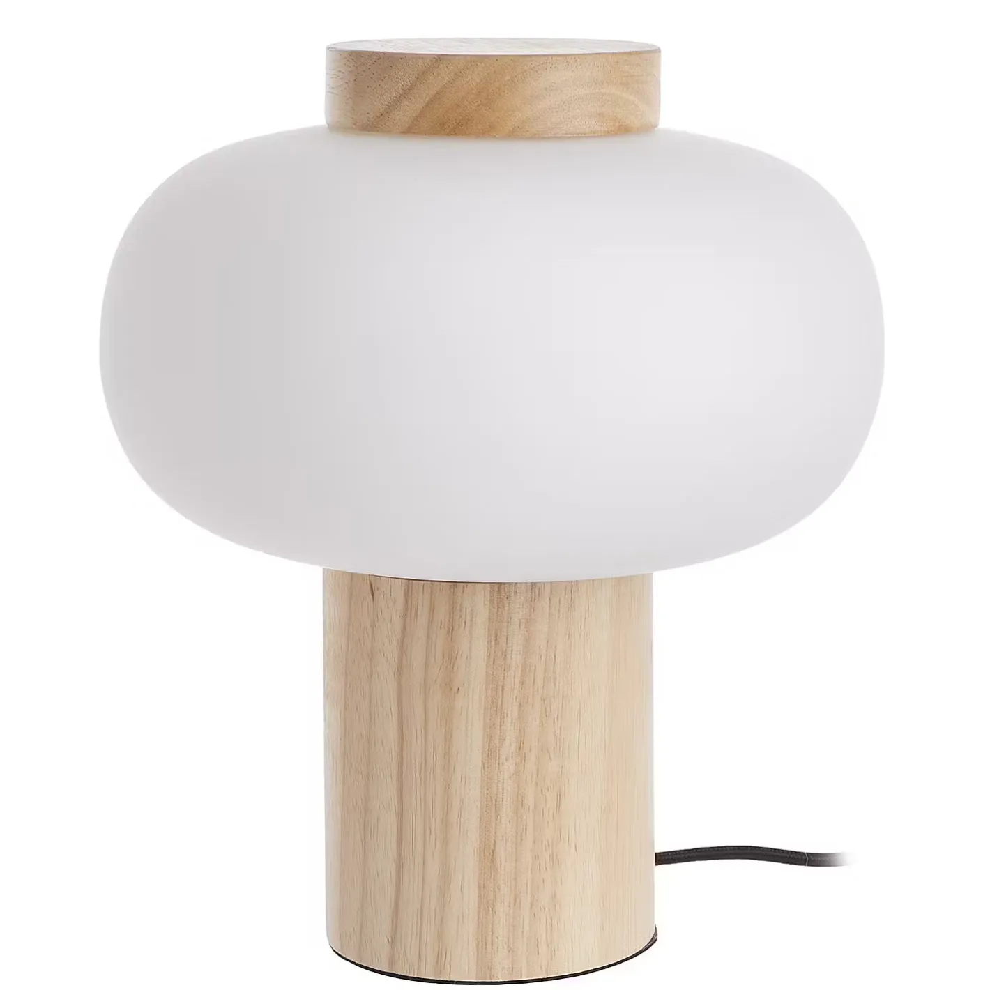Weißes Glas trifft naturfarbenes Holz bei der modernen Taavi Tischleuchte, die mit Gummibaumholz, also einem nachwachsenden Rohstoff, hergestellt ist. Damit die Schönheit von Glas und Holz wirken kann, besinnt sich das Design auf klare, reduzierte Formen. So entsteht eine Tischlampe, die sich vielseitig kombinieren und nutzen lässt, z.B. im Wohnbereich oder Schlafzimmer.