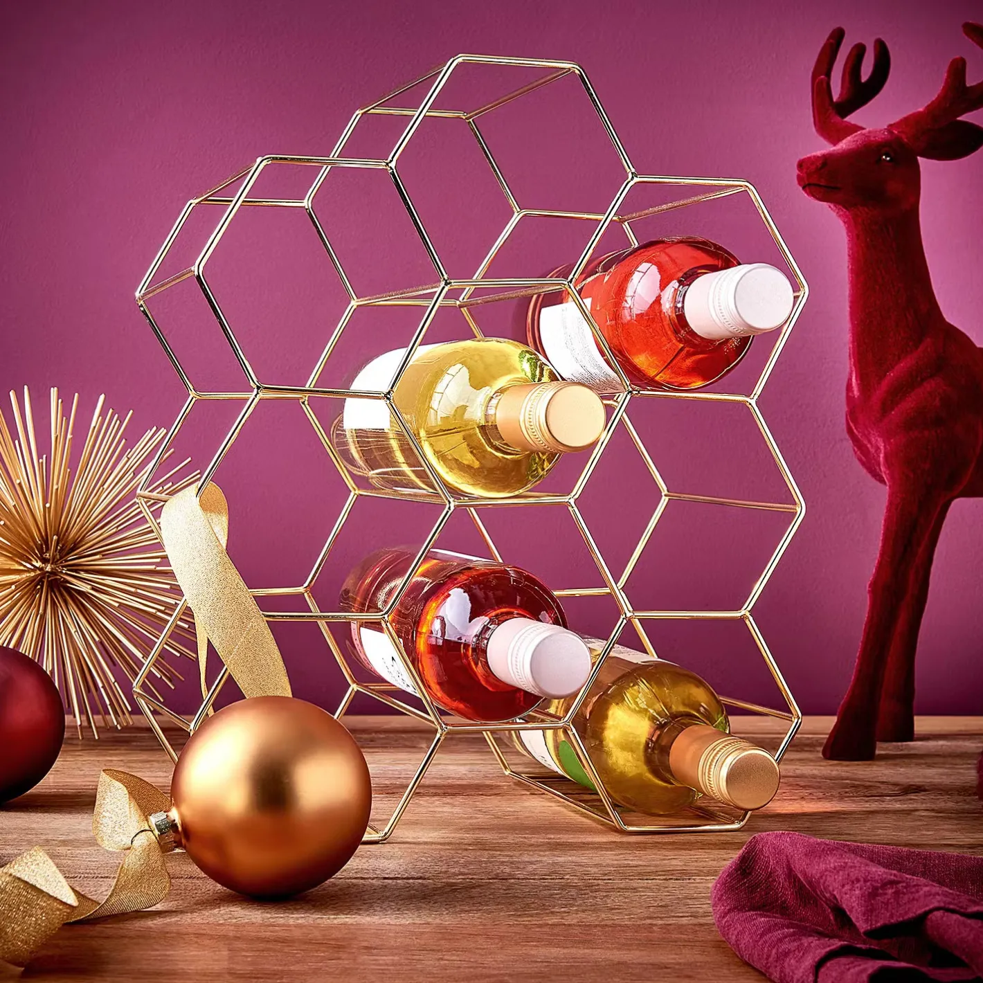 - Weitere Qualitätsmerkmale: Heute heben wir das Glas auf das goldene Cubicle Weinregal für 9 Flaschen und trinken auf die elegante Verbindung von Aufbewahrung und Dekoration. Denn dieses Weinregal aus Eisen hält nicht nur Weinflaschen praktisch griffbereit, sondern setzt auch edle Flaschen mit schönem Etikett stilecht in Szene. Dabei harmoniert das Weinregal perfekt mit Ihrer Skandi-Küche oder Ihrem Wohnzimmer im glamourösen Stil. Wenn das kein Grund zum Feiern und Anstoßen ist…