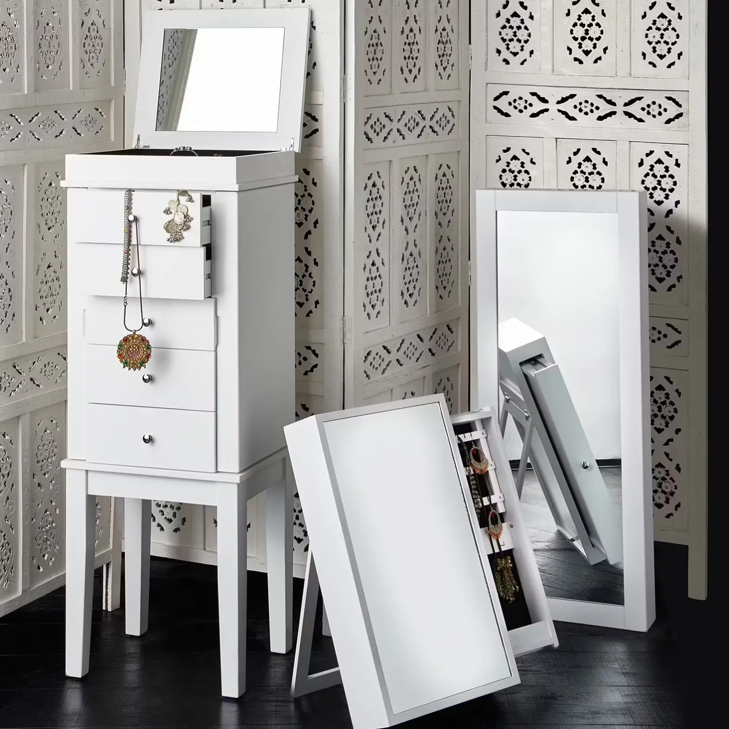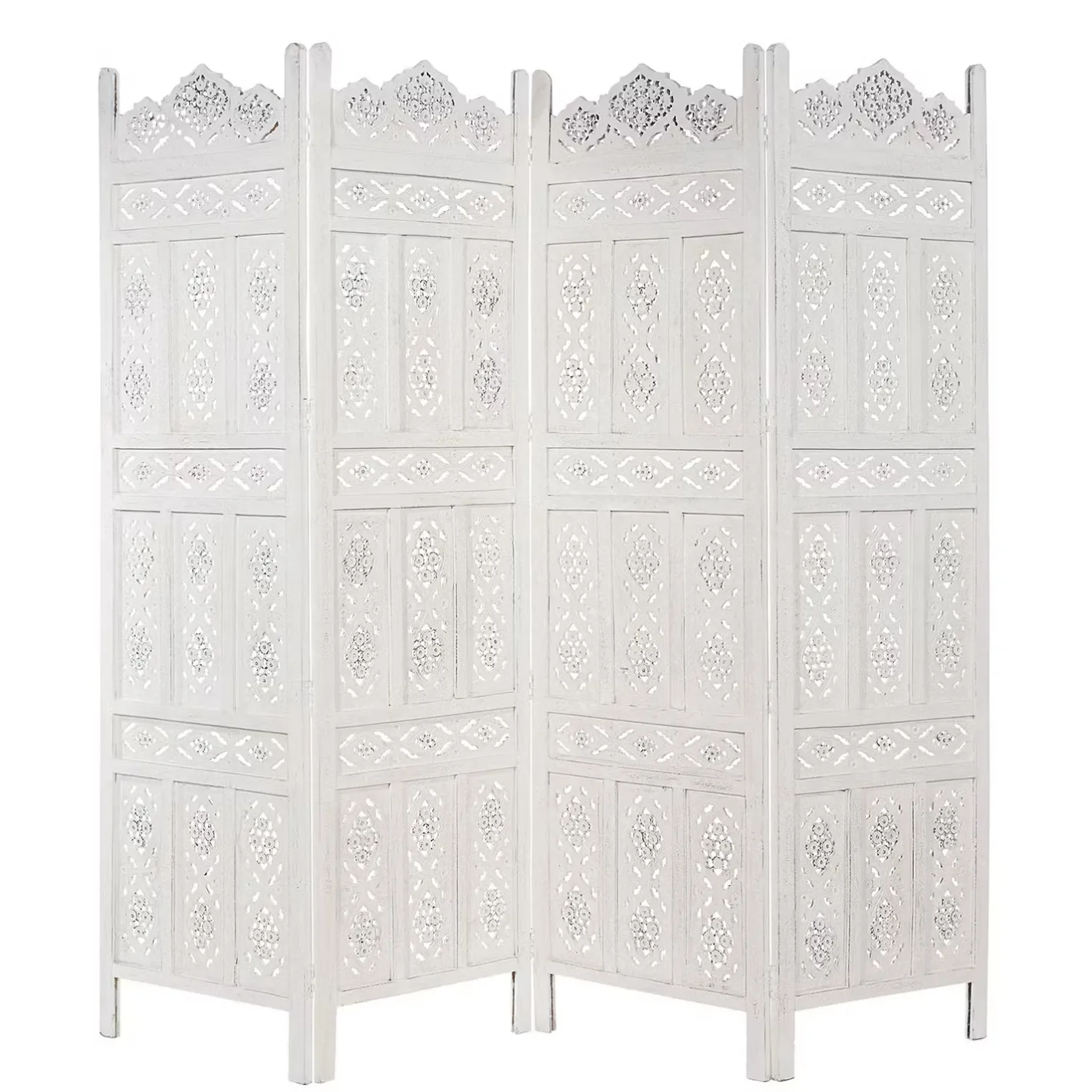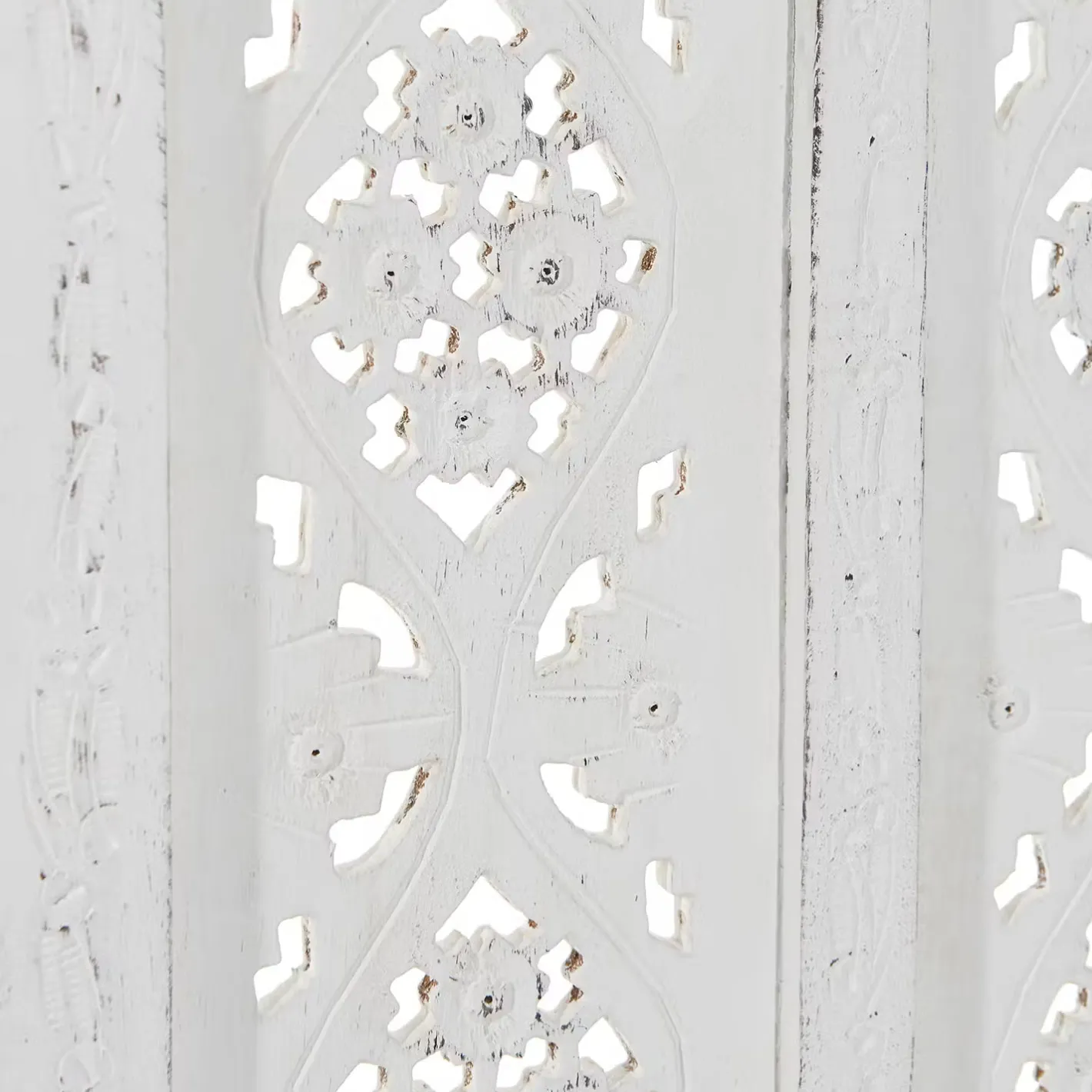 Als stamme er aus einer spanischen Finca, einer italienischen Villa oder einer portugiesischen Posada: Unser weißer Estella-Paravent mit femininen Ornamenten versehen, präsentiert sich charmant nostalgisch und aufwändig gearbeitet. Mit Liebe für das Detail. Denn er wurde von Hand gefertigt und bemalt. Ob als Raumteiler, als Sichtschutz oder Dekoelement: Der Paravent im Vintage-Look ist vielseitig nutzbar und weist zu dem einen modernen Shabby-Chic-Stil auf.