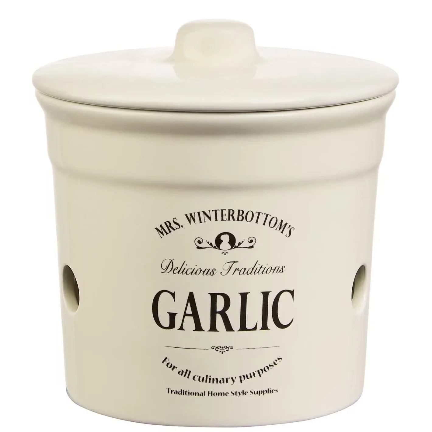 - Weitere Qualitätsmerkmale: Mit dem Mrs. Winterbottom’s Knoblauchtopf im englischen Vintage Design bringen Sie Ordnung mit System in ihre Küche! Geräumig und stilvoll bietet der runde Behälter mit einem 14 cm Durchmesser genügend Platz für die Knoblauch-Lagerung und das Aufbewahren anderer Vorräte. Der Topf mit Deckel bietet Schutz vor Dreck, lagert alles ordentlich und trocken durch praktische Luftlöcher und passt mit seiner Retro Form perfekt in typische Küchen im modernen oder Landhausstil.Robustes Steingut: Sicheres Aufbewahren leicht gemachtEnglischer Vintagestil als perfekt passendes SortimentSchlichte Form mit praktischem DeckelgriffDunkle und belüftete LagerungVerhindert Aroma-Übertragung auf andere LebensmittelVerhindert Aroma-Übertragung auf andere Lebensmittel